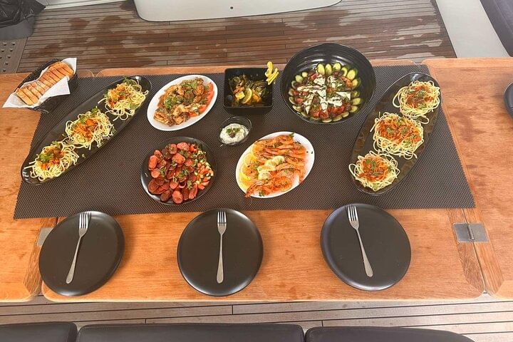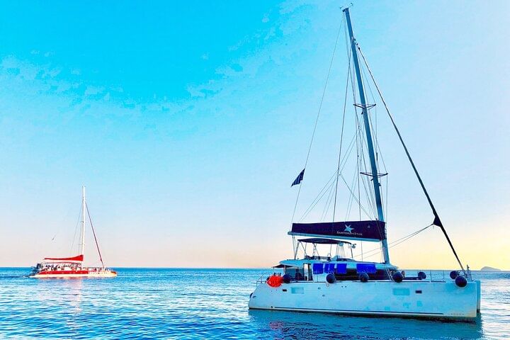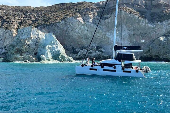 โฆ Departure from Ammoudi Bay Board your elegant catamaran from the charming Ammoudi Bay, nestled beneath the cliffs of iconic Oia.