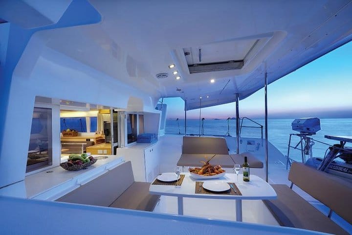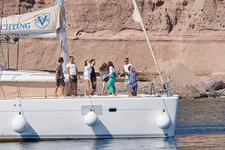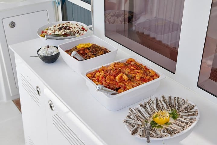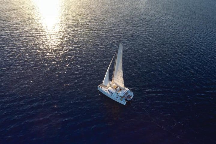 Setting sail from Vlychada port discovering the beautiful beaches with the differents colors because of the Volcanic eruption and the crustal clear blue water enjoying the unlimitide open bar of Local Wines and beers. We will arrive to Thirasia Island to taste plates of deliicious traditional sea food and BBQ on a Luxury Lagoon Catamaran 450 travelling in the magical view of the Volacono and Caldera .